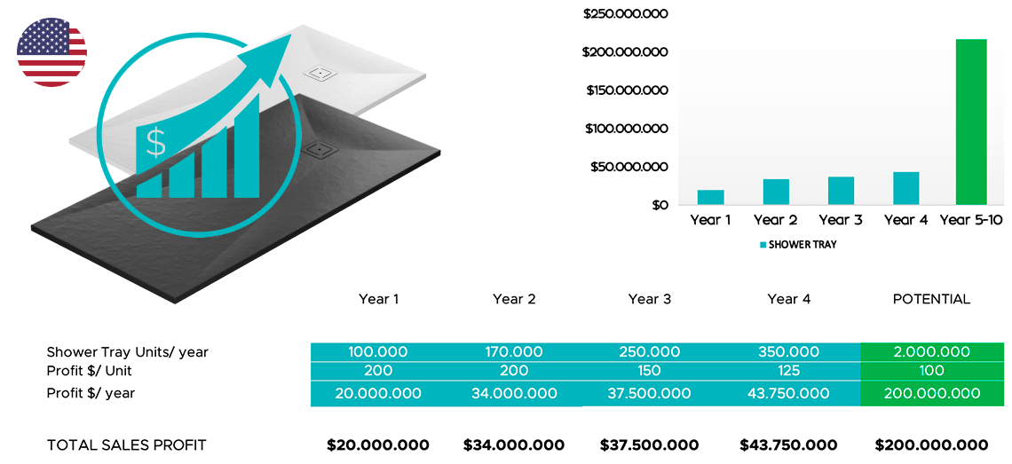 The bathroom sector, together with new composite products, has grown exponentially in Europe over the last 15 years. In particular, the resin shower tray has been introduced in 8 out of 10 European homes, consolidating its position as the most demanded product in the European bathroom sector. At present, it is being introduced in the USA in a very favorable way and it is expected that its growth and implementation will surpass the European market. The most important companies in the bathroom sector are already establishing themselves in the U.S. in order to take advantage of this business opportunity.